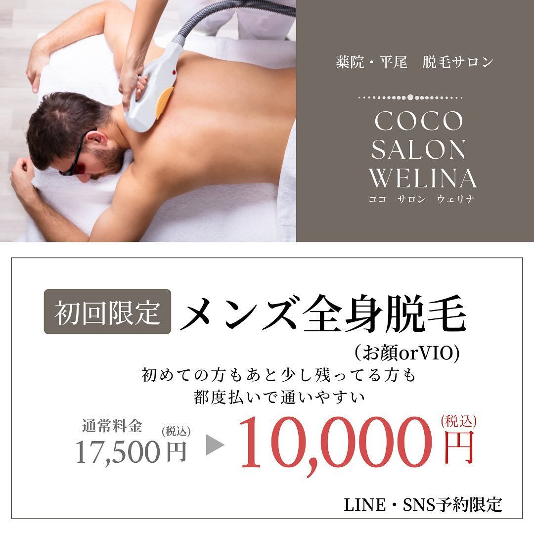 2024・11月キャンペーン【初回限定】メンズ全身脱毛キャンペーン 2024.11.11 【初回限定】メンズ全身脱毛キャンペーン 初めての方もあともう少し残っている方も都度払いで通いやすい 通常料金 ➡ ¥17,500円 ☟☟☟☟☟☟☟☟☟☟☟☟☟☟ ¥10,000円(税込み) ※LINE・SNS予約限定 ☝☝☝☝☝☝☝☝☝☝☝☝☝☝ 2022年8・9月キャンペーン 前の記事 2025・3月キャンペーン【脱毛】オトナ女子の身だしなみ 次の記事